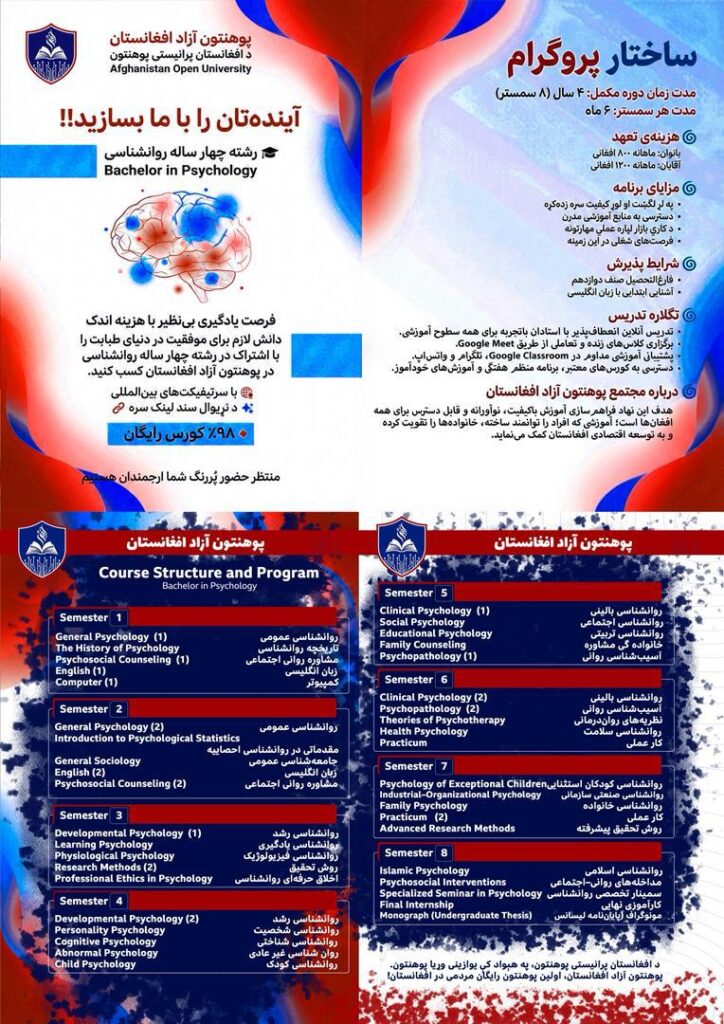 Afghanistan Open University offers internationally aligned online bachelor’s degree programs designed to provide accessible, high quality higher education. Our programs combine strong academic foundations with practical learning, preparing students to meet real-world challenges through flexible online education.